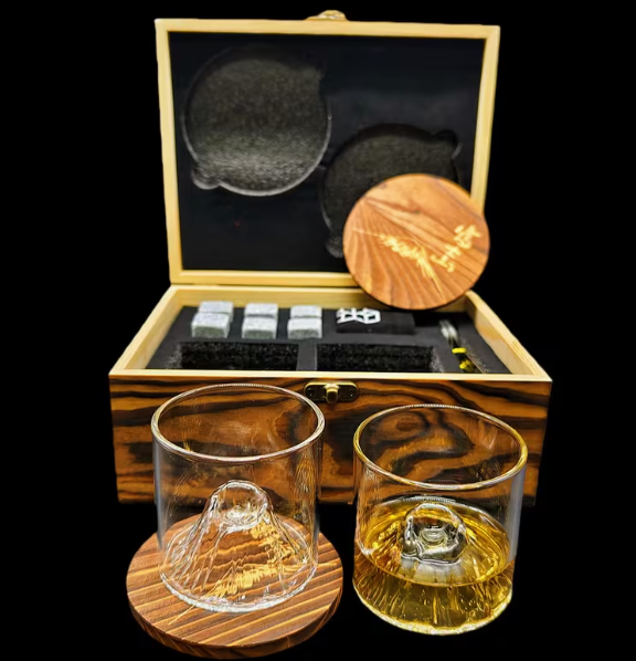 Coffret whisky premium comprenant un verre élégant, des pierres à whisky réutilisables et un sous-verre en bois, le tout présenté dans un écrin en bois raffiné. Idéal pour une dégustation sans dilution et une idée cadeau d'exception.