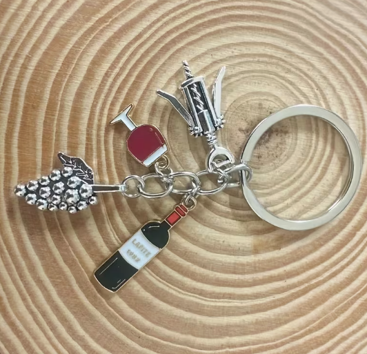 Porte-clés élégant en métal émaillé, avec motif raisin rouge et verre à vin. Idéal pour hommes et femmes, fait main, parfait comme cadeau original ou accessoire fun pour vos clés ou votre sac.